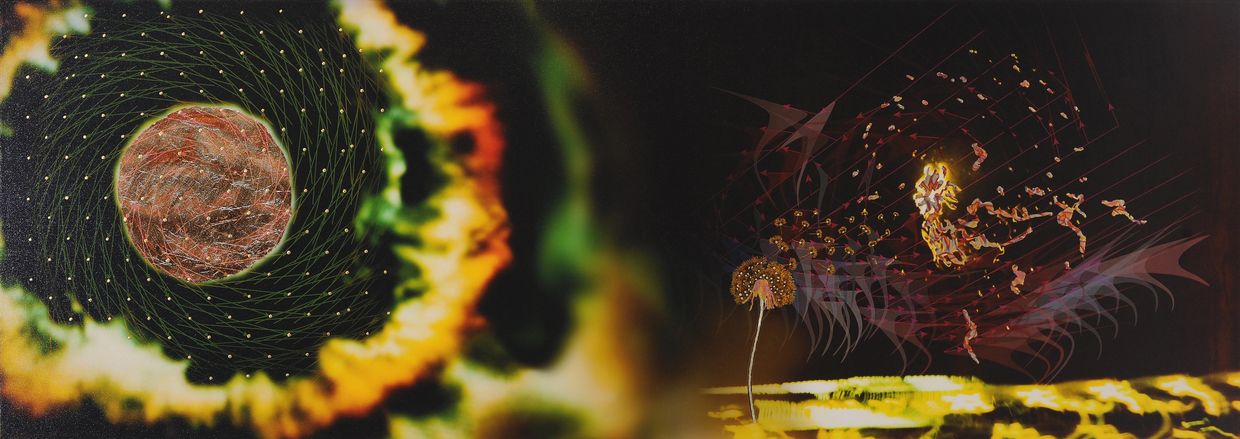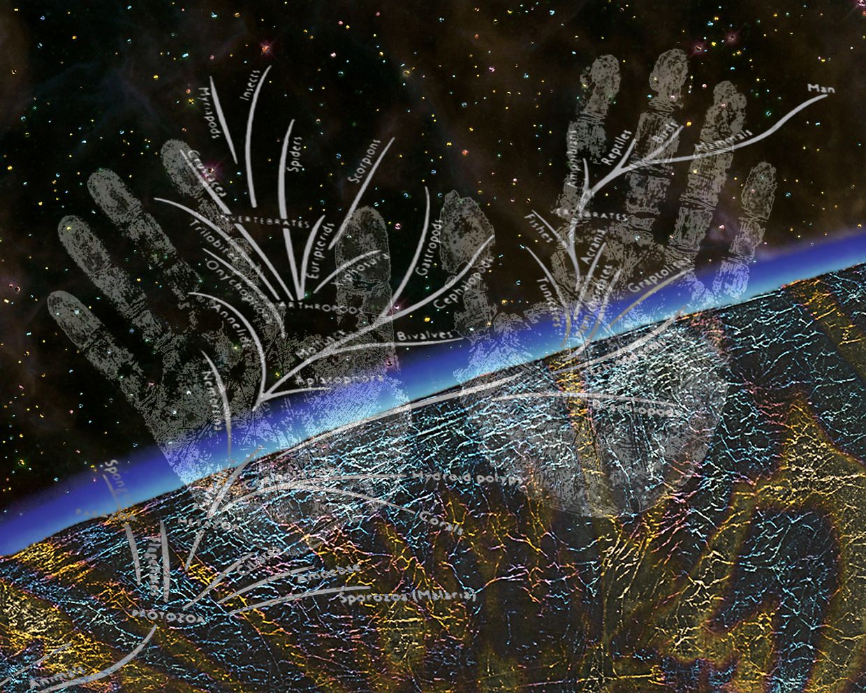 Against the backdrop of planet Earth and the thin sliver of atmosphere that protects life from the utter oblivion of deep space, a diagram of Gavin de Beer’s classic phylogenetic tree of the animal kingdom serves as a starkly graphic reminder that humankind is intimately interconnected with all life on the planet. Although it is unrealistic to hope that our activities as a species will have no impact on the integrated ecosystem within which we must survive, our technological behaviors have resulted in undeniable significant negative impacts that cannot be sustained. However, Einstein’s palm-prints not only stamp humanity’s ownership on the problem, but also give hope that we have the capabilities to solve the problems.
