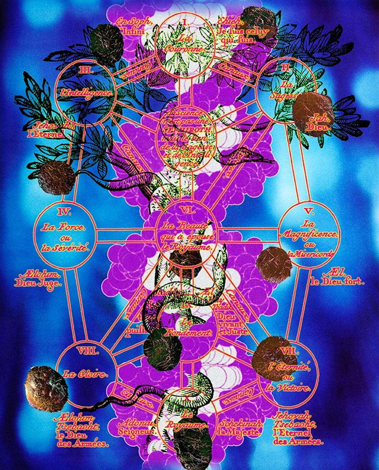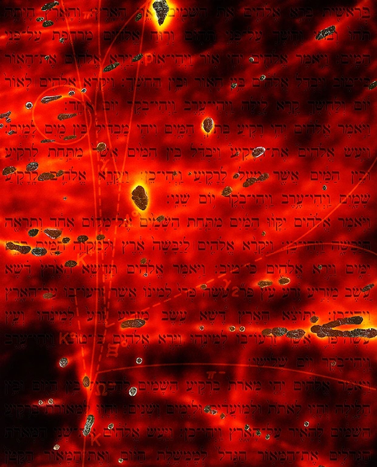 This work, a visual Midrash, or interpretation of scripture, reflects the profound poetry found in the Book of Genesis. The subtle lines in the background of the image chart the decay of subatomic particles—the discovery of which upended the Newtonian world of classical mechanics as surely as the scientific revolution overturned religious-based cosmology. Though science has disproved the biblical timeframe for the age of the universe, there remains plenty of room for rationality and reverence to peacefully coexist