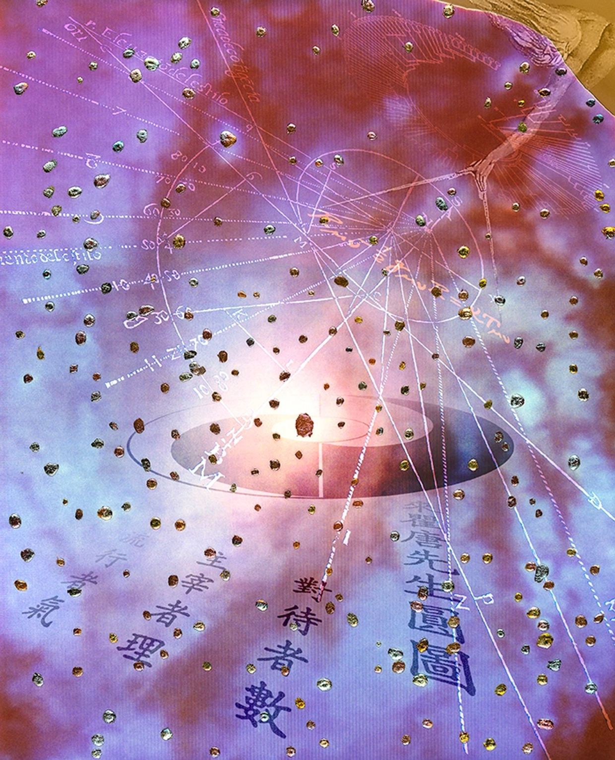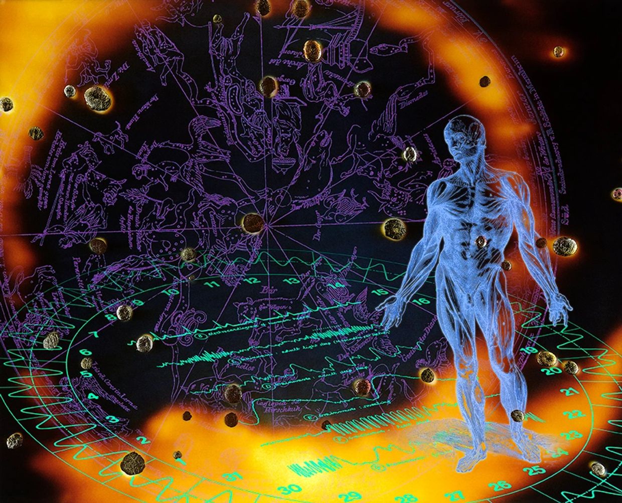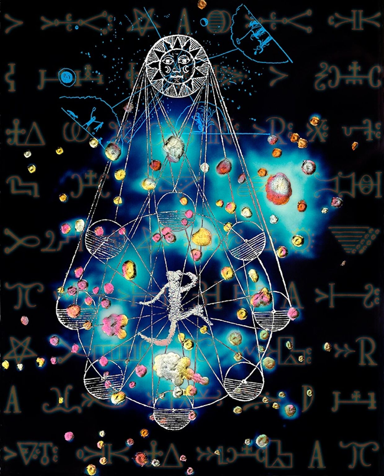 Invisible forces like gravity or magnetism pose a challenge for illustrators, who often find that dark, wispy lines are the best method of representing their abstract qualities. Philosopher Emmanuel Kant thought that space was filled by an imperceptible ‘œther’ through which planets and comets and other celestial bodies pushed their way, depicted in his drawings as a web-like arrangement of dots. Against this background, a ‘higher organizing order’ is represented by the wire-mesh diagram of an arm and hand - created from a scan of artist Clayton Spada’s limb. Orbiting around the central nebulous sphere, like the rings of Saturn, is an astrological calendar. Such timekeeping devices, while rooted in ancient observations of the night skies, are regarded today as metaphysical artifacts.