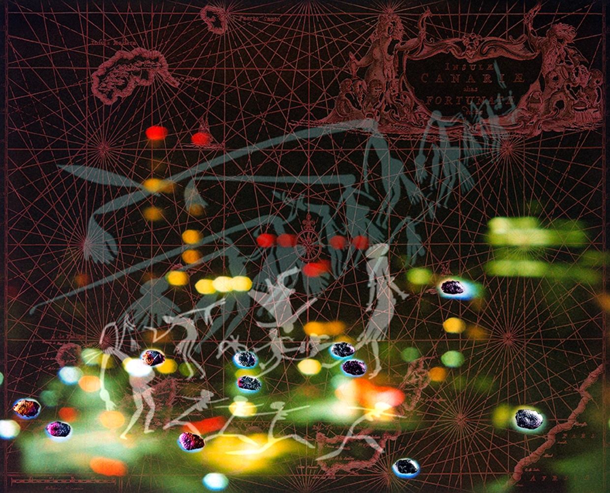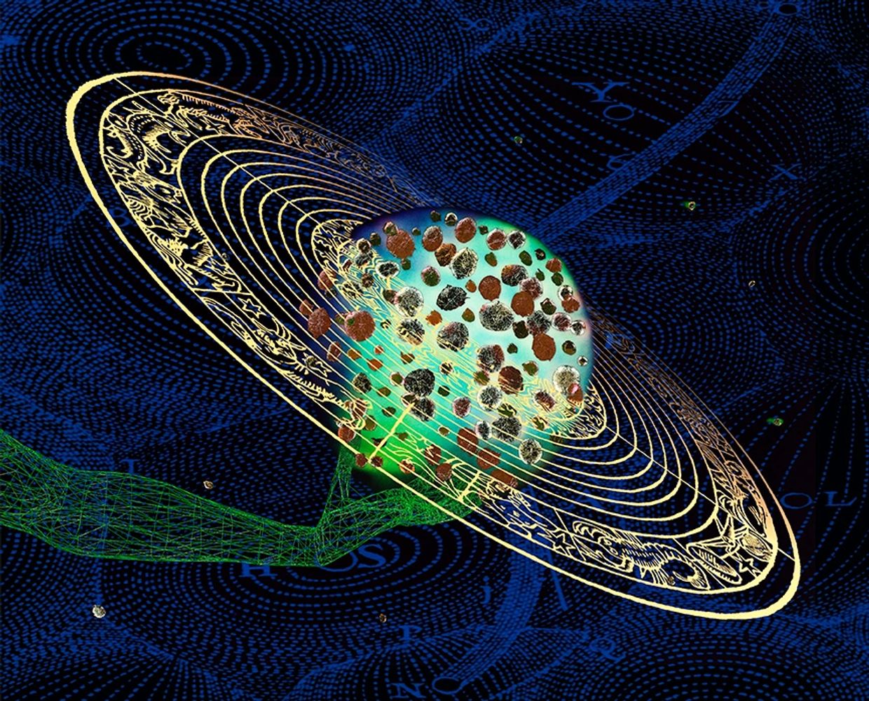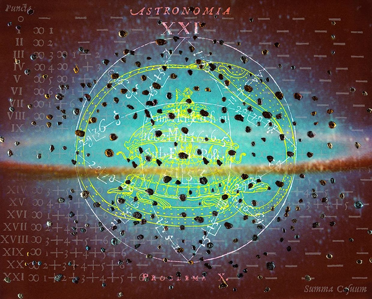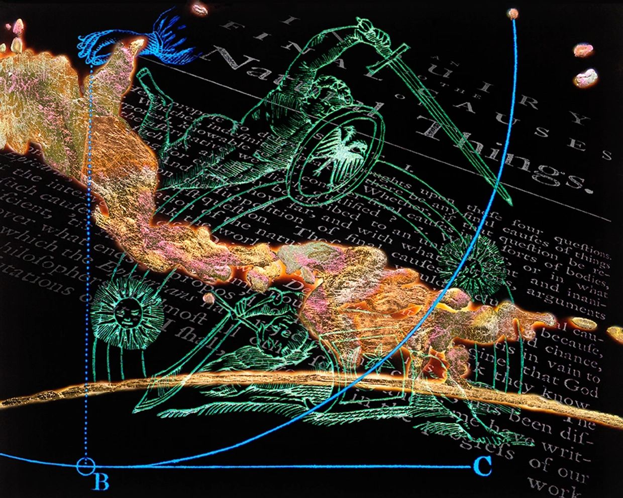 Invisible forces like gravity or magnetism pose a challenge for illustrators, who often find that dark, wispy lines are the best method of representing their abstract qualities. Philosopher Emmanuel Kant thought that space was filled by an imperceptible ‘œther’ through which planets and comets and other celestial bodies pushed their way, depicted in his drawings as a web-like arrangement of dots. Against this background, a ‘higher organizing order’ is represented by the wire-mesh diagram of an arm and hand - created from a scan of artist Clayton Spada’s limb. Orbiting around the central nebulous sphere, like the rings of Saturn, is an astrological calendar. Such timekeeping devices, while rooted in ancient observations of the night skies, are regarded today as metaphysical artifacts.