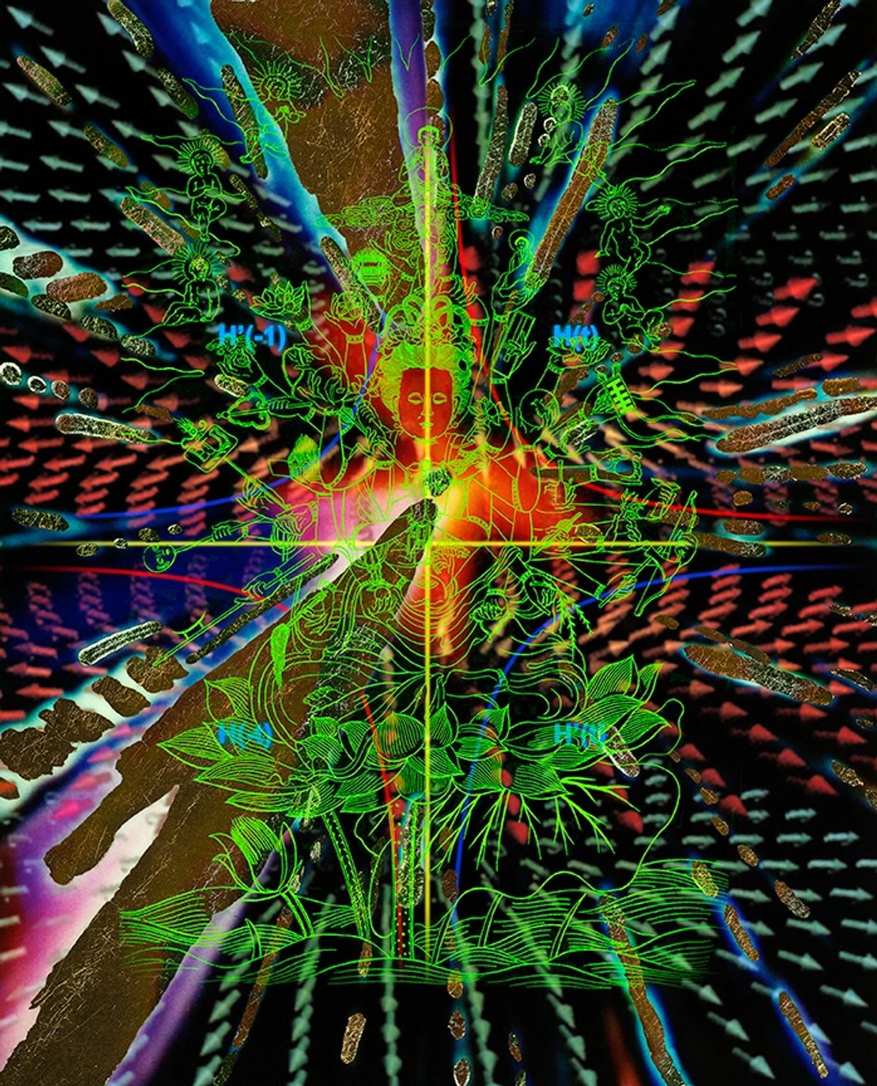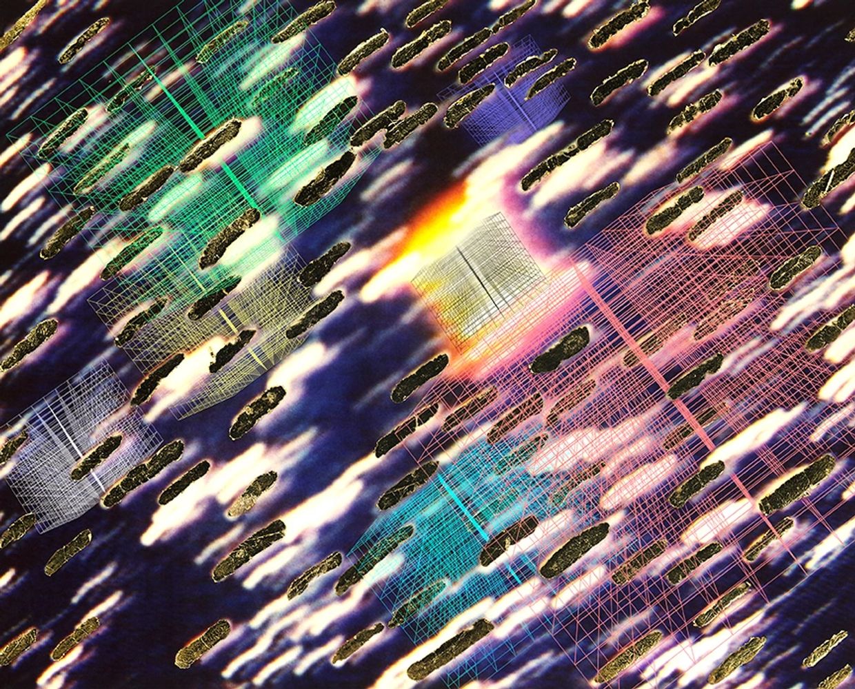 Prior to Einstein’s formulation of the Theory of Relativity, Newtonian mechanics described astronomical phenomena based on Euclidean space in which time is treated as universally constant. This revelatory theory threw the dependable operations of a clocklike world into disarray by hypothesizing that sufficiently large stellar objects could warp the fabric of space-time. Expanding on the Cartesian coordinate system that describes three-dimensional space; lattice-like cubes careening through a multicolored energy field recede into the distance, referencing the elusive fourth dimension of time.