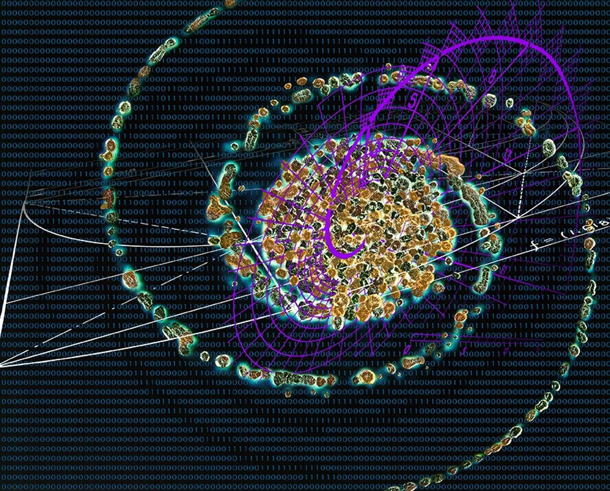 The spiral is a recurring geometric pattern found throughout nature - from the shape of a snail’s shell to the structure of galaxies. Spiral motifs abound in this work too: zeroes and ones in the background form a binary mapping of this ubiquitous shape, and two spirals interlock in the center, one free-form, the other generated from a logarithmic curve. The spira mirabalis, or miraculous spiral, is a manifestation of a mathematical foundation that describes a diverse range of phenomena, from the movements of celestial bodies to the growth patterns of individual organisms and entire populations of organisms to the vagaries of the stock market and other human behaviors. The white lines slicing through the image refer to the venerable Golden Ratio, approximately 1:1.618, identified long ago by the Greeks as a harmonic proportion between the length and width of an object.