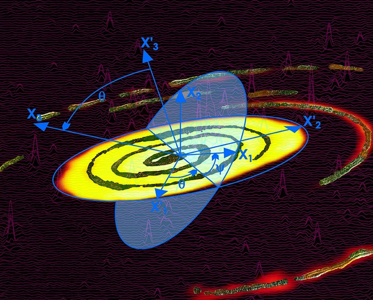 The ecliptic is the celestial latitude in three-dimensional space in which the planets orbit the Sun. This work explores the systems we create in defining our reality; a geometric explanation of the ecliptic plane shows the relativity of our abstract human constructs when set against more expansive contexts. The background image depicts a small section of outer space mapped by a radio telescope. The spikes represent energy signals rising above background “noise,” intriguingly suggestive of matter that exists where one would expect to find nothing but the void.