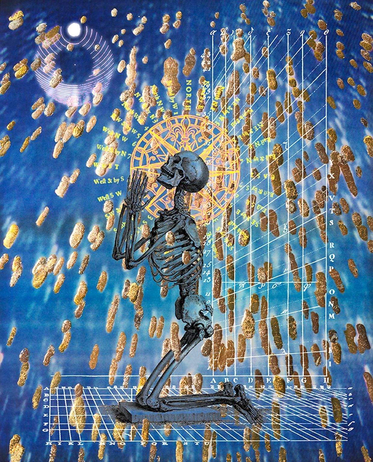 In this work, a running human figure from an aboriginal petroglyph is situated within an illustration depicting planetary phases relative to the Sun. Like us, he is on a journey through life, pulled along as if attached to a puppeteer’s strings. In the background can be seen characters from a pictographic script invented by a European missionary who sought to translate the Bible into the language of the Micmac, a large Native American tribe that lived in Canada and the Northeast United States. Whether by intention or coincidence, the characters bear a structural similarity to Egyptian hieroglyphics. In the end, this impressive intellectual effort proved largely unsuccessful in pulling the Micmac away from its established system of beliefs.